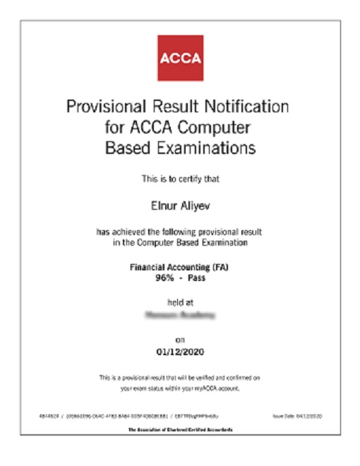 Tələbəmiz və daha sonra isə bilik və bacarəqlarəna görə əməkdaşımız olan Elnur Əliyev ACCA FA imtahanında 96% nəticə əldə etmişdir
